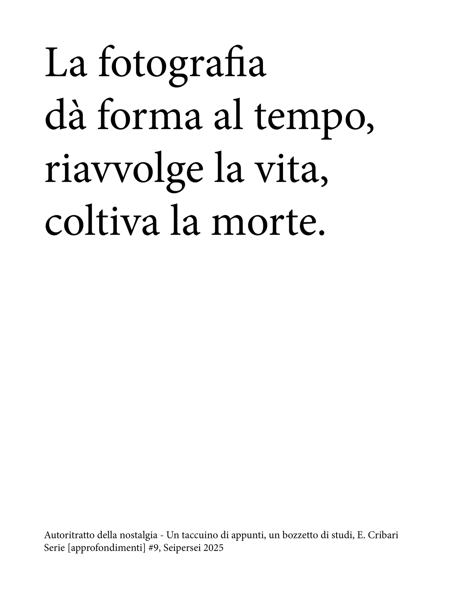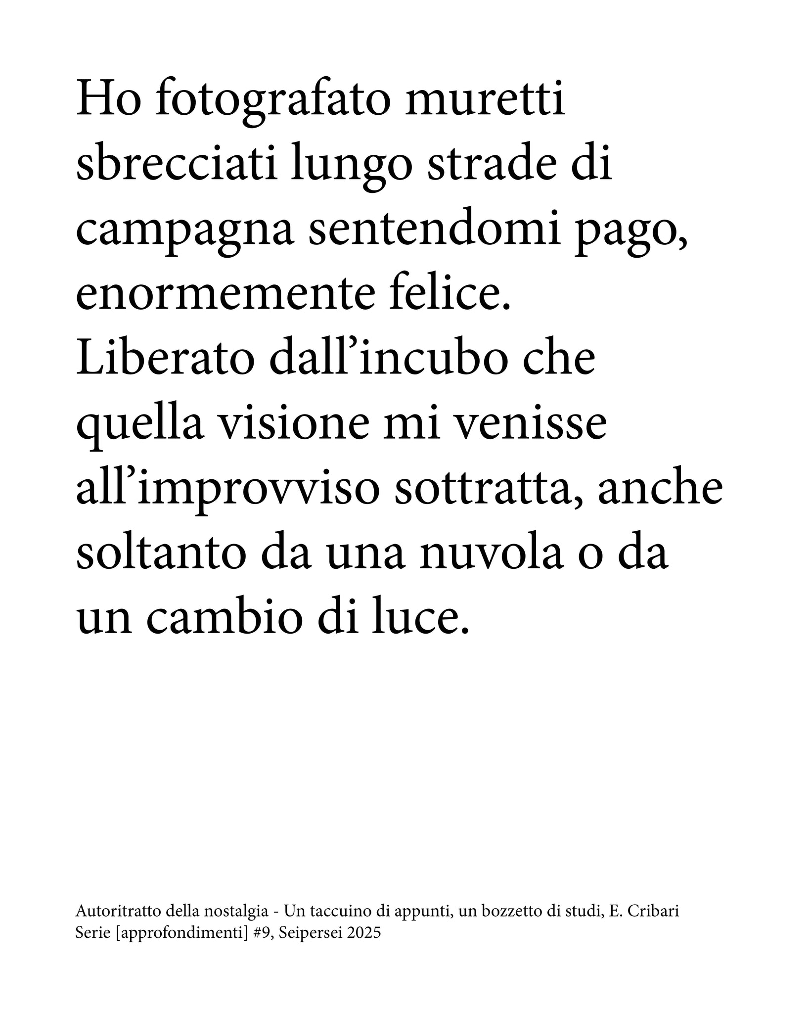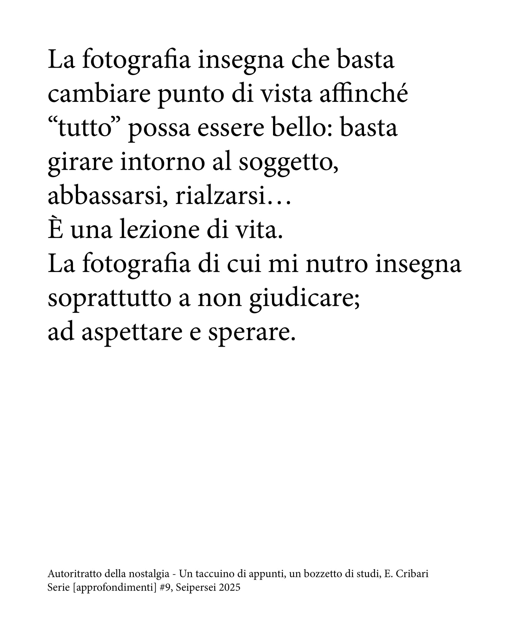 Con questo breve ma denso diario di note, aforismi, ricordi e pensieri, Emiliano Cribari – poeta, fotografo e cercatore di luoghi perduti – ci guida nell’intimo di sue riflessioni su fotografi, scrittori e registi che ne hanno segnato il percorso, sia a livello artistico che umano. Autoritratto della nostalgia è un libro cucito su frammenti, su vecchie e nuove polaroid scattate a parole in cui il mezzo fotografico, quasi spogliato di ogni filosofia, viene trattato come un custode di tempo passato, un fabbricatore di ricordi.